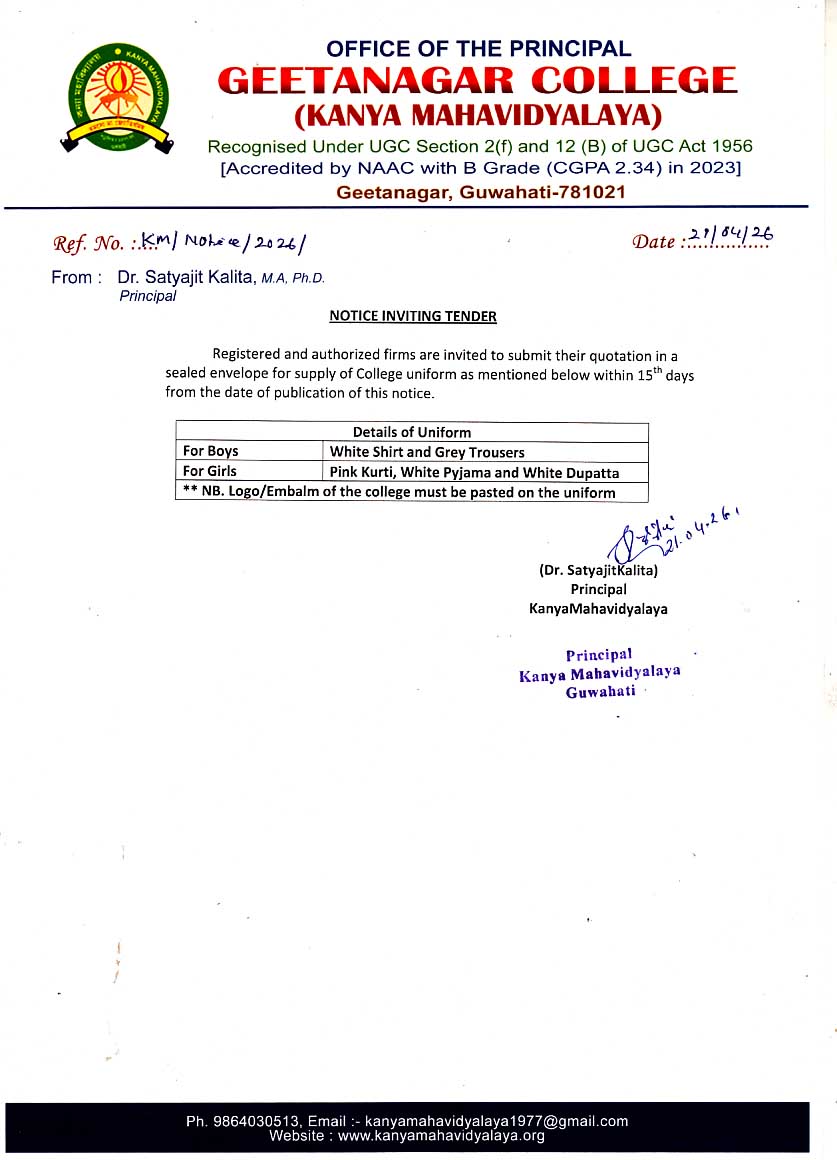 Geetanagar College, the higher educational institution for Girls, is located at Geetanagar within Guwahati City at a distance of seven kms from Guwahati Refinery, Noonmati and five kms from the State Zoo. Geetanagar College was born in the year 1977 by dint of untiring efforts made by a group of eminent educationists, distinguished personnels with reputes and free thinkers from the various sections of the society. Read More